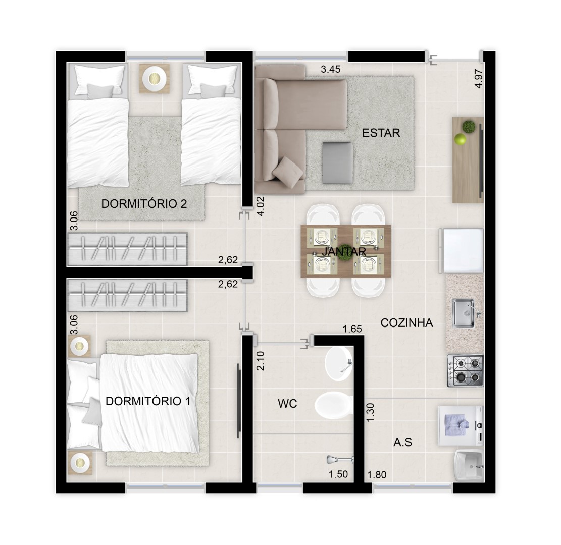 Os apartamentos possuem ventilação natural, ambientes integrados, piso cerâmico em todos os cômodos e medição individual de água, gás e esgoto, promovendo mais conforto, economia e sustentabilidade no seu dia a dia.